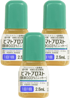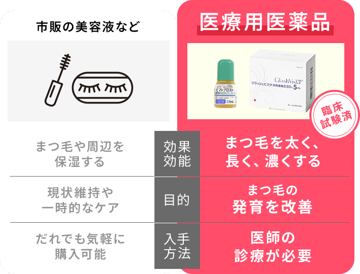 継続することによってまつ毛貧毛症を改善する効果を実証した「ビマトプロスト」配合薬を処方。まつ毛を太く・長く・濃くする効果があるのは、医師の処方による医療用医薬品だけです。